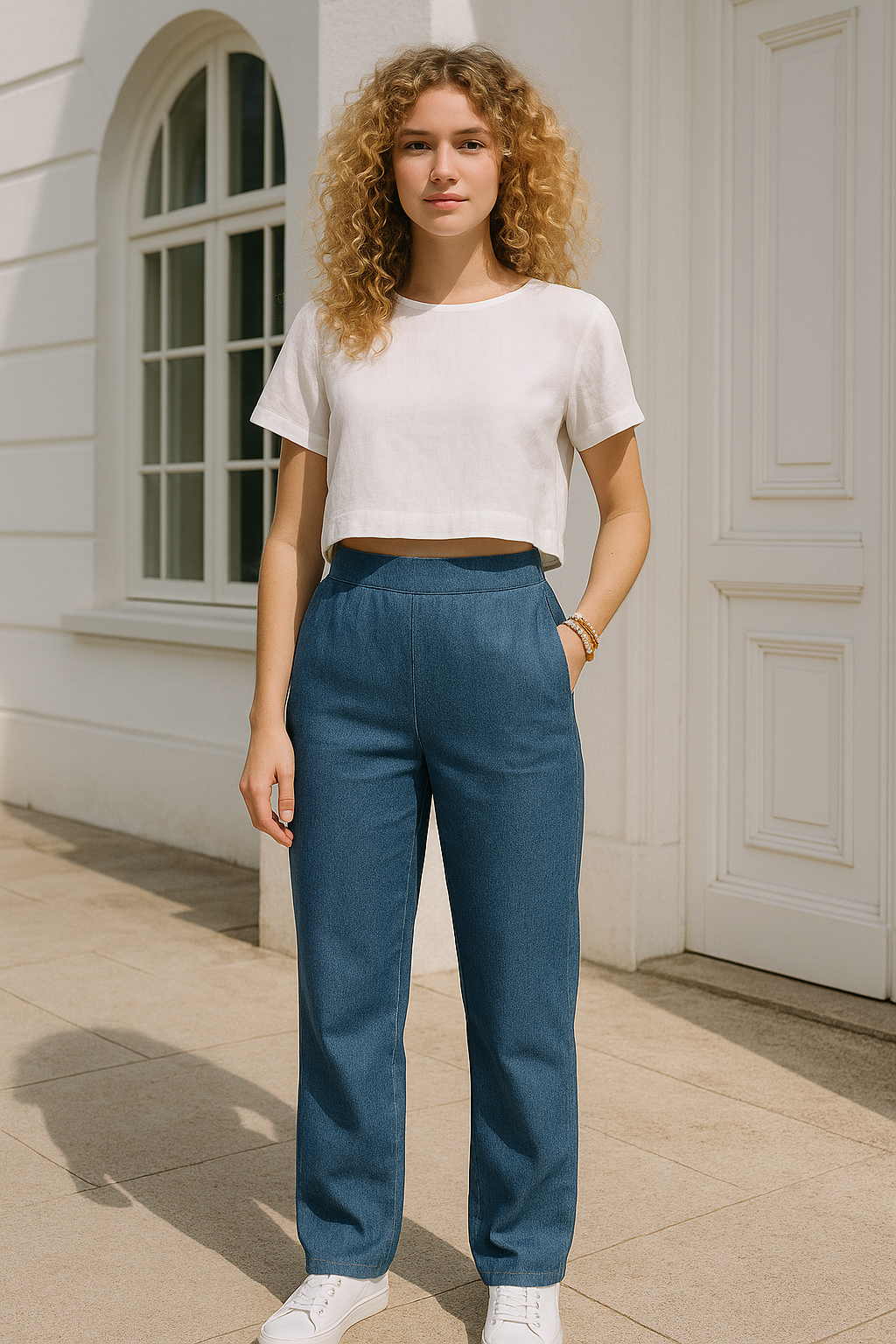 Featuring slash pockets, a flat front waistband, and an elastic back for stylish everyday comfort, these pants are perfect for woven fabrics and create a beautifully balanced fit from waist to hem.